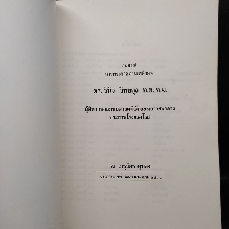 ขายหนังสืออนุสรณ์การพระราชทานเพลิงศพ ดร.วินิจ วิทยกุล